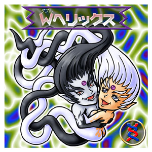 デザインモチーフは、Wヘリックスはまんま二重螺旋です。エロかっこキモい雰囲気を醸し出したかったんですが、さて? イェネアの方は、名前は思いついたもののそこから先が思い浮かばず、「遺伝っつったらまずはメンデルの法則だよな……」などと口ごもりつつ豌豆をつけたりしてます。ところで、描いてる途中で気付いたんですが、豆の蔓なんかもヘリックスっていうらしいですね。この偶然をどうしよう。