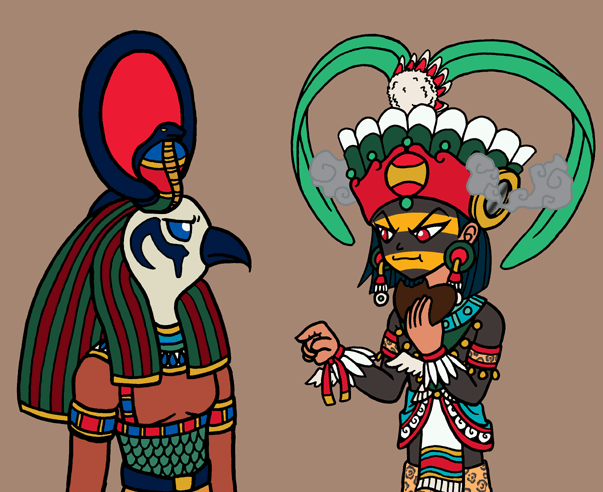 エジプトの太陽神・ラーとアステカの最初の太陽・テスカトリポカ。 エジプトのアブシンベル神殿の碑文を見ていたら「太陽の如き永遠の生」なんてフレーズがあったので、「でも本当は太陽も永遠じゃないよね」なんて考えていたらテスカトリポカが乱入かましてきたから、こんな妙な2ショット。 テスカトリポカが食べているのはハート形チョコレートです。アステカ時代のチョコレートは固形のお菓子じゃなくて飲み物だったのは知ってますが、敢えて。