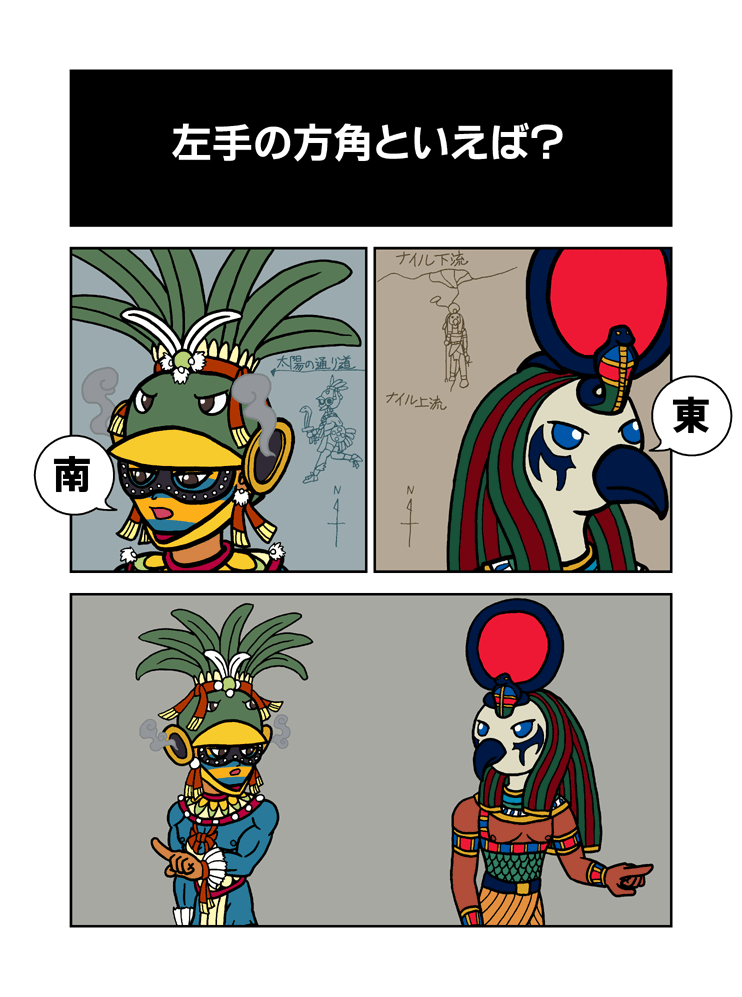 opochtli(オポチトリ)…ナワトル語で「左・南」 iabety(イアベティ)…エジプト語で「左・東」 ウィツィロポチトリの名前の意味を知った時に「へぇ、アステカだと左は南なんだ。エジプトだと左は東なのに……文化の違いって面白いね」と思ったことが元になって、この作品はできました。